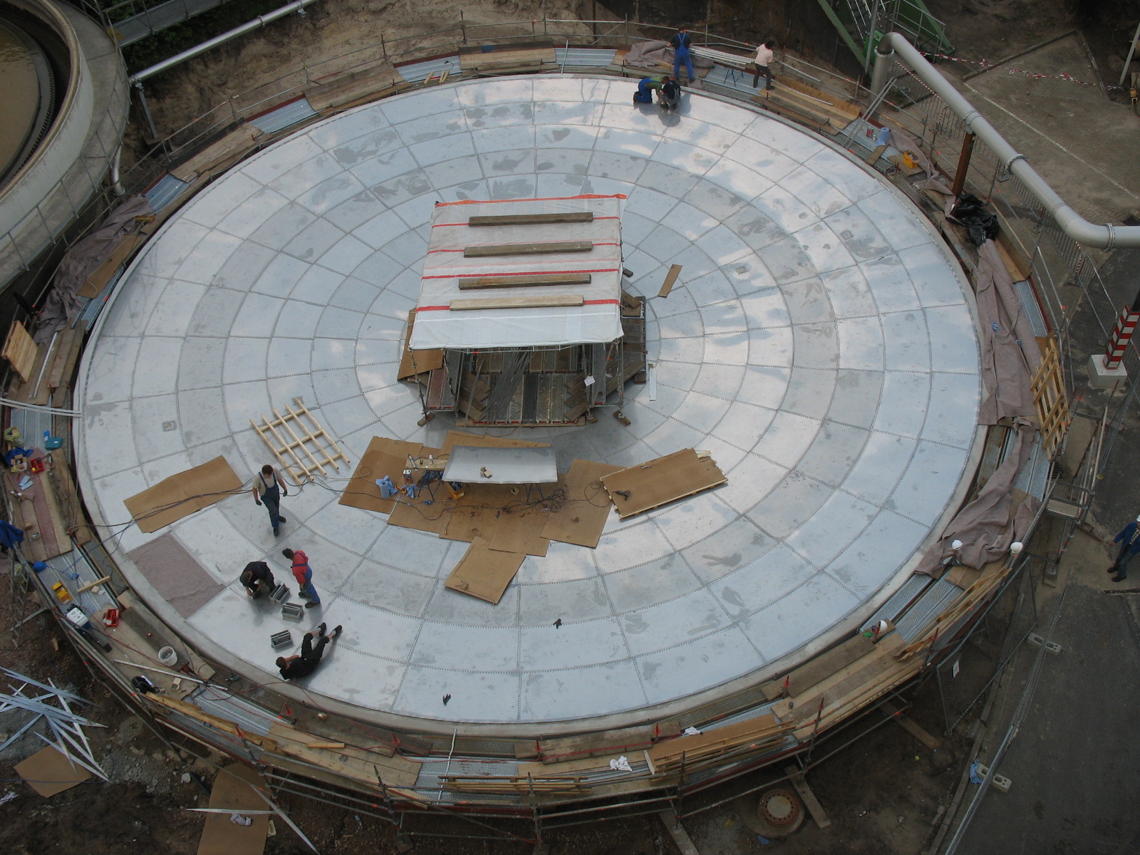 Eine weitere Besonderheit ist die Ausstattung mit einem Edelstahlboden. Der Edelstahlboden wird in Segmentbauweise mit 10 mm Vlies-Unterlage zwischen der Stahlbetonsohle (Genauigkeit 1 cm) und den Edelstahlblechen erstellt. Die Bleche werden mit einer dauerelastischen und abwasserbeständigen Dichtungsmasse überlappend und flüssigkeitsdicht verschraubt. Die Randbleche werden werksseitig auf die Rundung zugeschnitten. Der Edelstahlboden ist zusammen mit dem umlaufenden Winkel auf der Betonplatte mit Edelstahlschrauben und Edelstahldübeln befestigt.