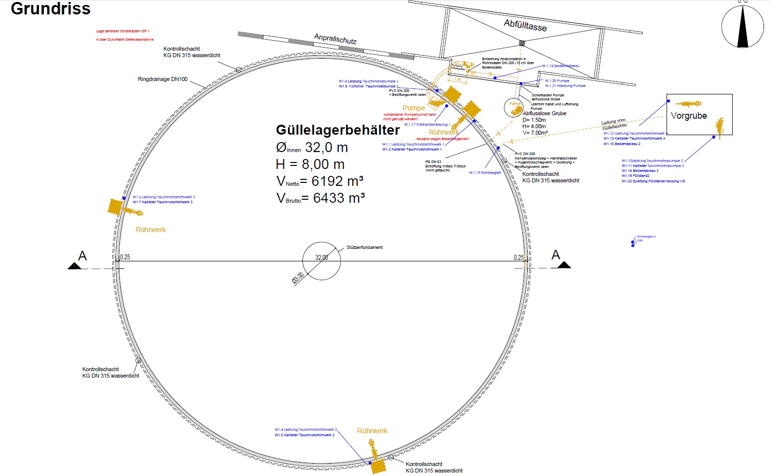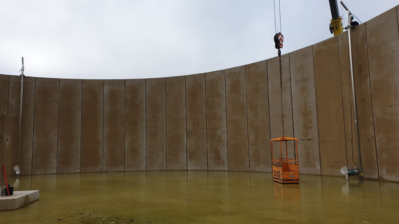 Zustäzlich enthält dieser Behälter eine getauchte Güllepumpe TMP3 (Tauchmotorpumpe) mit einer Leistung von 22 kW, die der Fassbefüllung vom Behälter aus dient. Sowohl die Güllepumpe als auch die drei Güllerührwerke werden an stabilen Führungsschienen befestigt und sind über Galgen höhenverstellbar.