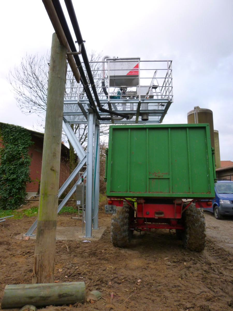 Die Schweinegülle wird aus einer Sammelgüllegrube mithilfe einer kleinen Tauchmotorpumpe in die Separationsanlage gepumpt. Die neuen Rohrleitungen führen zum Separator, der in einigen Metern Höhe angebracht wurde. Hier wird die ca. 5 % TS enthaltene Gülle durch den Pressschnecken-Separator in Fest- und Flüssigphase getrennt. Die Flüssigphase läuft über die Rohrleitungen zurück in das Gülle-Endlager, während die Feststoffe über eine Trichtervorrichtung hinunterfallen. Darunter wird ein Kippanhänger positioniert, der die Feststoffe sammelt. Dieses Konzept zeigt, wie das Lagervolumen und die Transportwürdigkeit der Gülle auf effektive Weise verbessert werden kann.